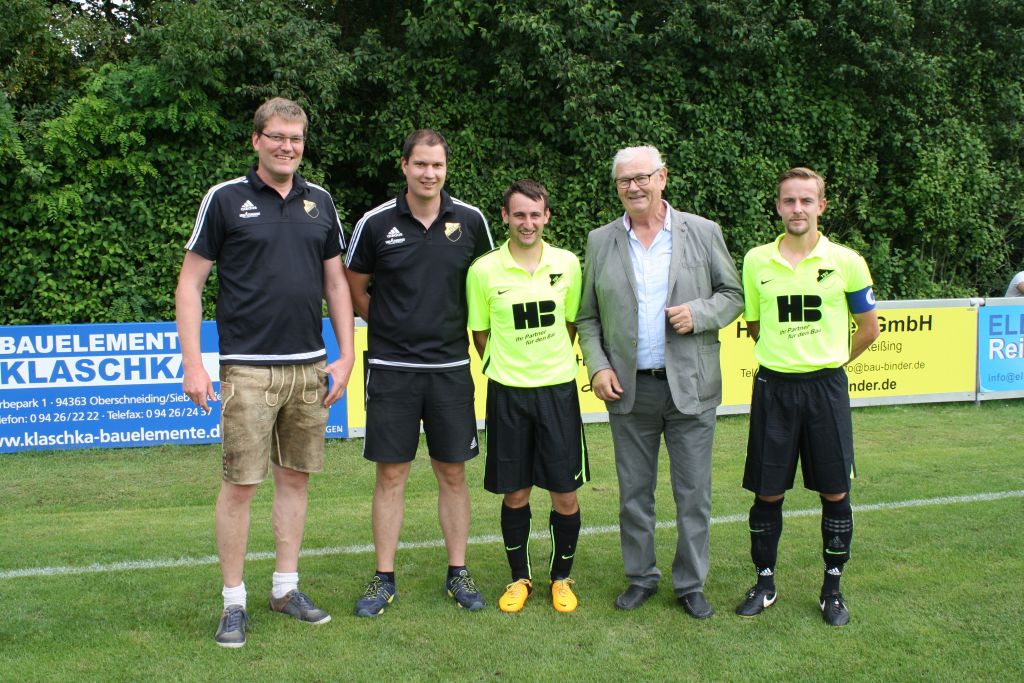 Foto: Vorstände Matthias Rust und Johann Gögl, Peter Schmerbeck, Bauunternehmern Hans Binder und Peter Lange bei der Übergabe der neuen Trikots an die 1. Mannschaft des TSV Oberschneiding